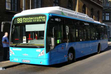Más szóval Ezt a technológiát már elemeztük a CNG technológia oldalon. A jármű alacsonypadlós, ülések tekintetében hozza a kötelezőt. Kívülről természetesen a járműveket az antidemokratikus BKK színre fényezték. A jármű belső színezése kissé furcsa (a piros korlátok), de hát mégis Franciaországból jött. A járművet ellátták külső „karácsonyfa” kivilágítással, így a látássérült vasárnapi autósok is észreveszik. Utastájékoztatás alapfokú (elektronikus tábla és bemondós). Az ajtók működése kissé más mint az A300-as modelleknél. Ezek nyitáskor kissé kiugranak a járműből. Itt célszerű az utasoknak távolságot tartani amíg nem nyílt ki teljesen az ajtó. A belső tér kiképzése megfelelő. Több mint három babakocsinak van hely (pl. 99-es járaton ez nagyon fontos). A babakocsis térben hiányoljuk a lehajtható üléseket, mert ezek nagyon praktikusak (lásd Bambínó). A külső ajtónyitó gomb BKV-s közelítő-érzékelős típusú (pl. TW 6000). Ezzel mindig gond volt (kesztyű, meddig nyomd, stb.), itt jobb lett volna a VanHool standard nyomógombos. A székeken ott van a VanHool leesésgátló. Ez ehhez a fürgeséghez szükséges tartozék. Picit csúfítja a képet, hogy a kerekesszékeknek nincs lehajtható rámpája, csak egy kézzel kirakható sínpárja. A babakocsik helyére természetesen utasok is állhatnak, ami (nagy)városi busznál nem egy hátrány. Belső zajcsillapítása jobb mint az AG300-as típusnak. A jármű beltéri zaja még menet közben is igen alacsony. Így a jármű elején tisztán hallani mit beszélnek a motor mellet ülők. Ez már vastagon megfelel a mai követelményeknek. A jármű kilmatizált. Mivel a típus ezen verzióját már eleve klímásra tervezték, ezért az ablakok csak 4 helyen és csak kis felületen nyithatók. Tehát jó lesz rendben tartani a klímaberendezést. A járművet úgy tervezték, hogy az utca szennyezett levegőjét az utasok csak szűrőn keresztül kaphassák meg, direktben (ablakon át) ne. Ezért a négy kis ablak üzemszerűen csak a jármű takarításakor használatos. Másik oldalról a jármű ablakai nagyméretűek, így napsütés hatására a belső tér gyorsan felmelegszik mint egy üvegház. Mivel a hűtés (Magyar szokás szerint) a nyitott ablakokon át nem biztosítható, ezért 20C felet kötelező a jármű saját légkeringető rendszerének bekapcsolása. Részünkről a klíma bekapcsolásának csak 30 fok fölött vagyunk a hívei. A jármű mérsékeltégövi változat nagy panorámaablakokkal és jó hőszigeteléssel. Ez télen hasznos, nyáron viszont a járműnél ugyanaz a gond jelentkezik mint nagyablakos személyautóknál. Ha sokat várakozik a napon álló motorral, akkor felmelegszik a belső utastér. Indulás után kell néhány megálló, amíg a klíma le tudja hűteni az utasteret. Talán célszerű lenne UV taszító fóliával (lásd bambínó) bevonni az ablakokat. Motorja MAN EURO 3, váltója Voith D864. A VanHool ismét alkotott. A gázos motorok általában lustábbak a dizeleseknél. Ez a jármű valamiféle turbó rásegítővel kiküszöbölte ezt a tulajdonságot, így a CNG-s jármű meglepően fürge lett. Gyorsítási és lassítási karakterisztikája az általunk tisztelt AG300-as modellt idézi. Érzésünk szerint azonban mint európai modell ez a típus picit kevésbé figyel a komfortos lassítási és gyorsítási karakterisztikára. Külső zajcsiállapítása viszont kevésbé hetékony, de ezt kompenzálja a gázüzemű motor csendesebb működése. Így a jármű a kültéren is csendes. Rugózása megfelelő. Viszont kerékátmérője kisebb mint az A300 modellnek, és az üzemanyagtartály a tetőn van, ezért kissé rosszabbul viseli a budapesti szántóföldeket. Mivel a jármű maga száguldozásra csábít, ezért itt a vezetőknek kell visszafognia magát. Más szóval a lóerőket nem csak használni de uralni is kell tudni. Itt talán célszerű lenne felvenni a kapcsolatot a gyártóval, hátha tudnak valami beállítást, ami a szántóföldön közlekedéshez optimáis. A motor a jármű bal hátsó részén helyezkedik el (új iskola). Itt visszasírjuk az A(G)300 közép motoros felépítést, mert az megrendíthetetlen stabilitást adott a járműnek alacsonyabb utasszám mellett is. A (bal) hátsó motor a szántóföld minőségű budapesti főútvonalakon igen csak tengeri betegséget okoz. Másik oldalról ez a konstrukció elvitte magával a gyors haladásnál is biztosan állok a lábamon érzést (A300), így bizony lehet érezni a sebességet. Ezek a járművek EURO 3-as motorokkal vannak felszerelve. A CNG üzemanyag miatt sokkal kevesebb EURO 5,5 (EEV) szintű kárt okoznak a környezetben. Ezt ráadásul úgy érik el, hogy nincs szükség bonyolult motorra és szűrőkre, elég egy úgynevezett openloop EURO 3-as motor. Ez olcsóbbá, tartósabbá és egyszerűbben karbantarthatóvá teszi a technológiát. Ennek részletit lásd a EURO n besorolás és CNG oldalkon. Mivel üzemanyagtankja a jármű tetején helyezkedik el, ezért menettulajdonságai minden más járműtől különböznek. Erre a lényeges különbségre mindenképp nyomatékosan fel kell hívni a járművezetők figyelmét. Szakmai oldalról fontos tudatosítani a vezetőben, hogy a jármű súlypontja magasan van (főleg az A300-hoz képest) a tetőn lévő tank, az utasbarát felfüggesztés és a bal hátsó motor miatt. Ezért és a fürgesége miatt bizonyos helyzetekben nagyobb odafigyelést kíván. A jármű kanyarstabilitása rosszabb egy átlagos busznál, eddig az országban csak a Transzelektro/Skoda trolibuszoknál lehetett ilyesmivel találkozni. Ez nem az A330, hanem az LPG, CNG, FCH és E hajtás/üzemanyag sajátja. Ez megfelelő minőségű utakon ésszerű vezetési stílus mellett nem jelent problémát. Gyors kanyarokban kell figyelni odafigyelni, vagy ha olya