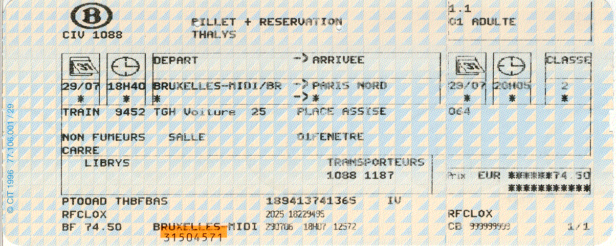 Thalys nagysebsségű vasút (Belgium) ablaknál vásárolható jegy: