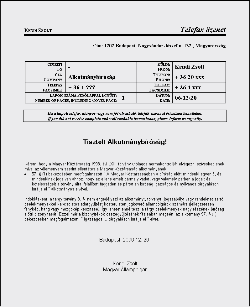 Kérem, hogy a Magyar Köztársaság 1993. évi LXIII. törvény utólagos normakontrollját elvégezni szíveskedjenek...