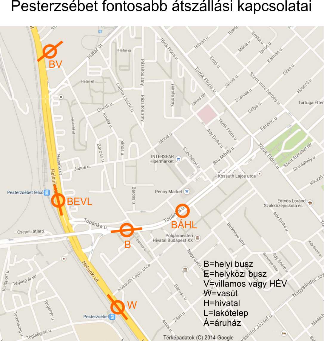 Pesterzsébet fontosabb átszállási pontjait az alábbi térkép szemlélteti: