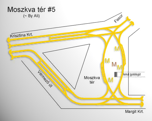 A város egyik (tömeg)közlekedés szempontjából legproblémásabb csomópontja a Moszkva tér. Alapvető baja hogy túl kis helyen túlságosan sok dolgot szeretnénk megvalósítani. Éppen ezért szervezetünk javasolja a tér átstrukturálását oly módon hogy a teljes villamoshálózat kéregbe kerüljön. A megvalósításhoz elképzelt vágányhálózatot a következő ábra szemlélteti:
