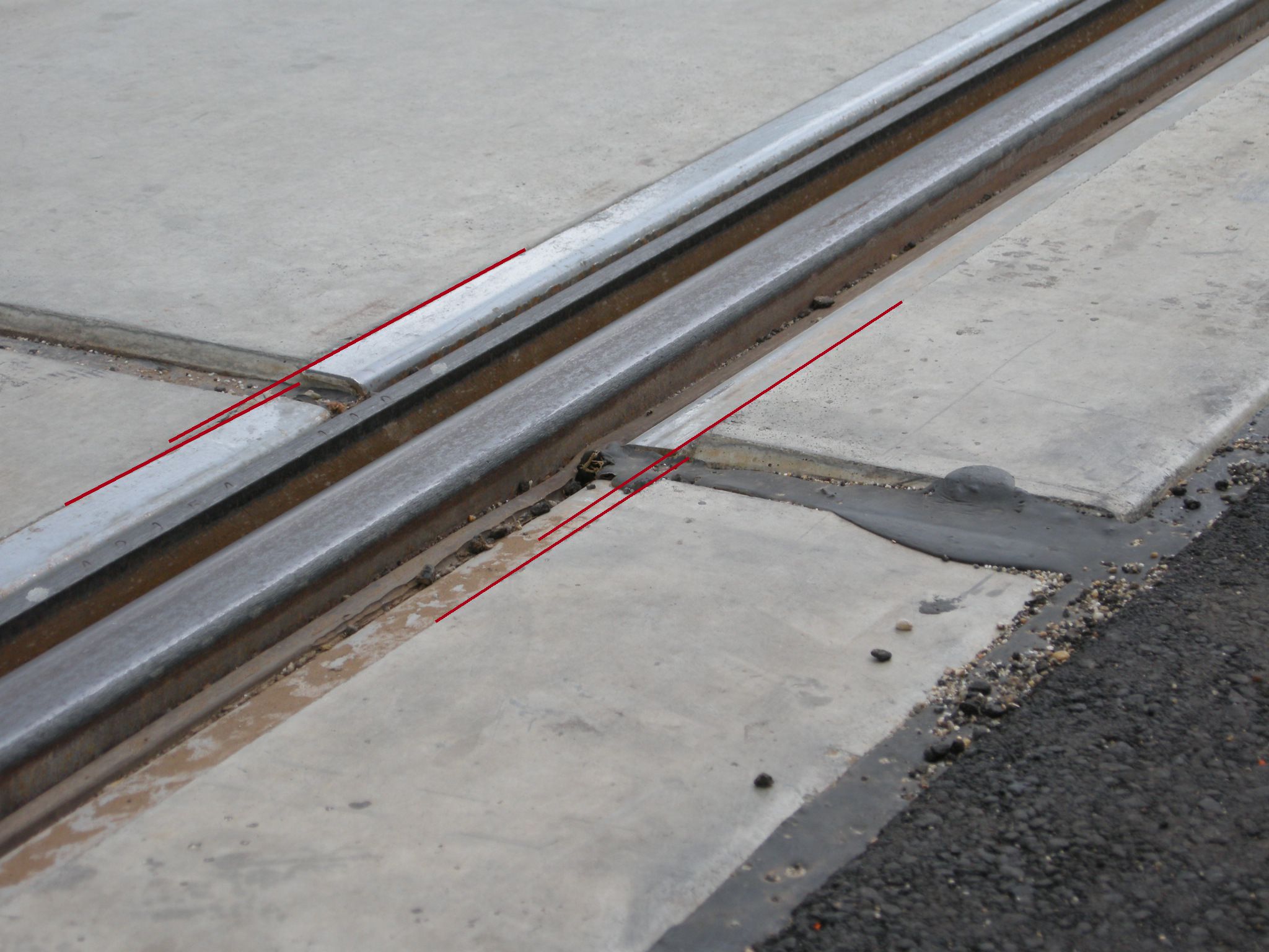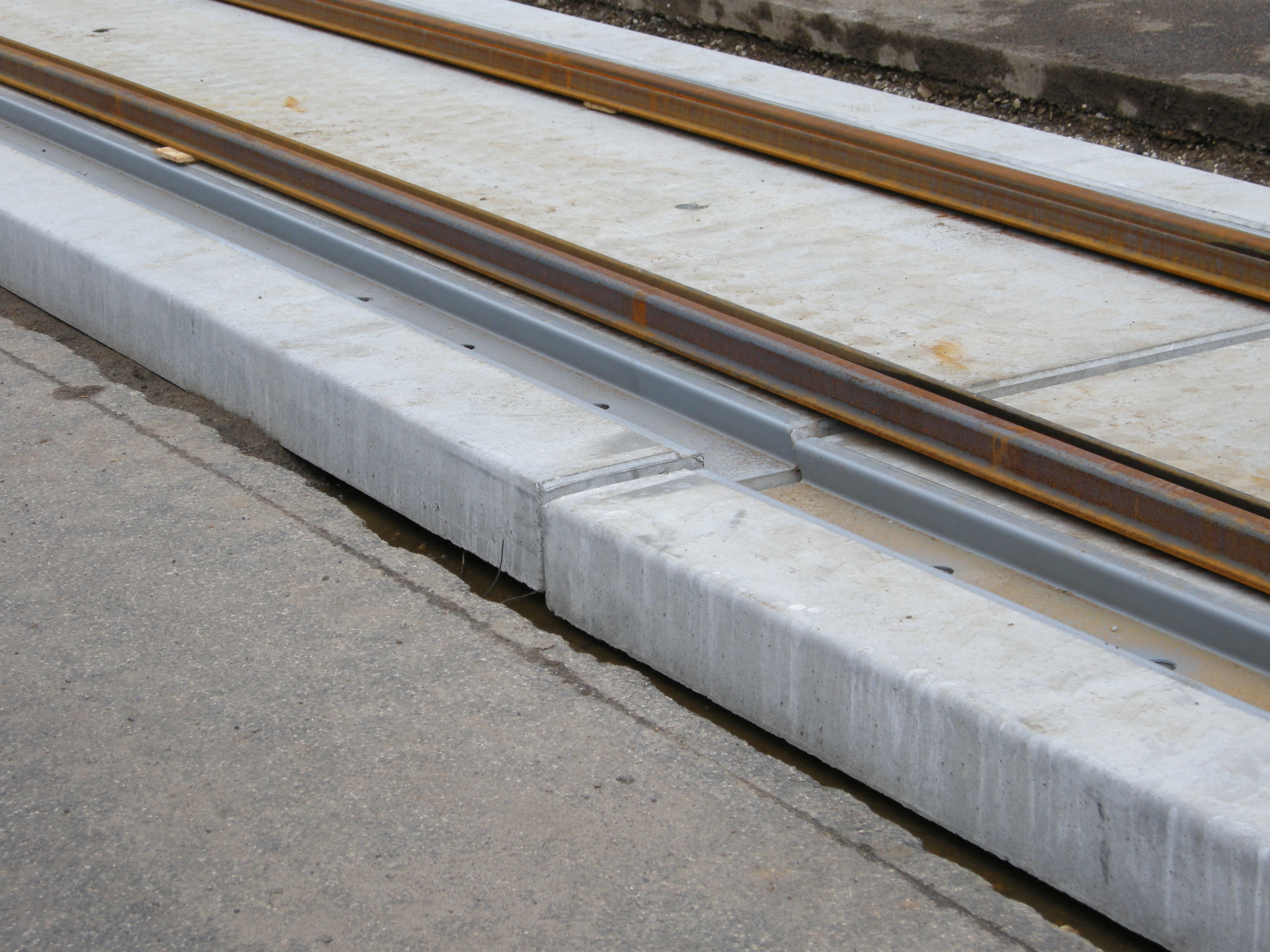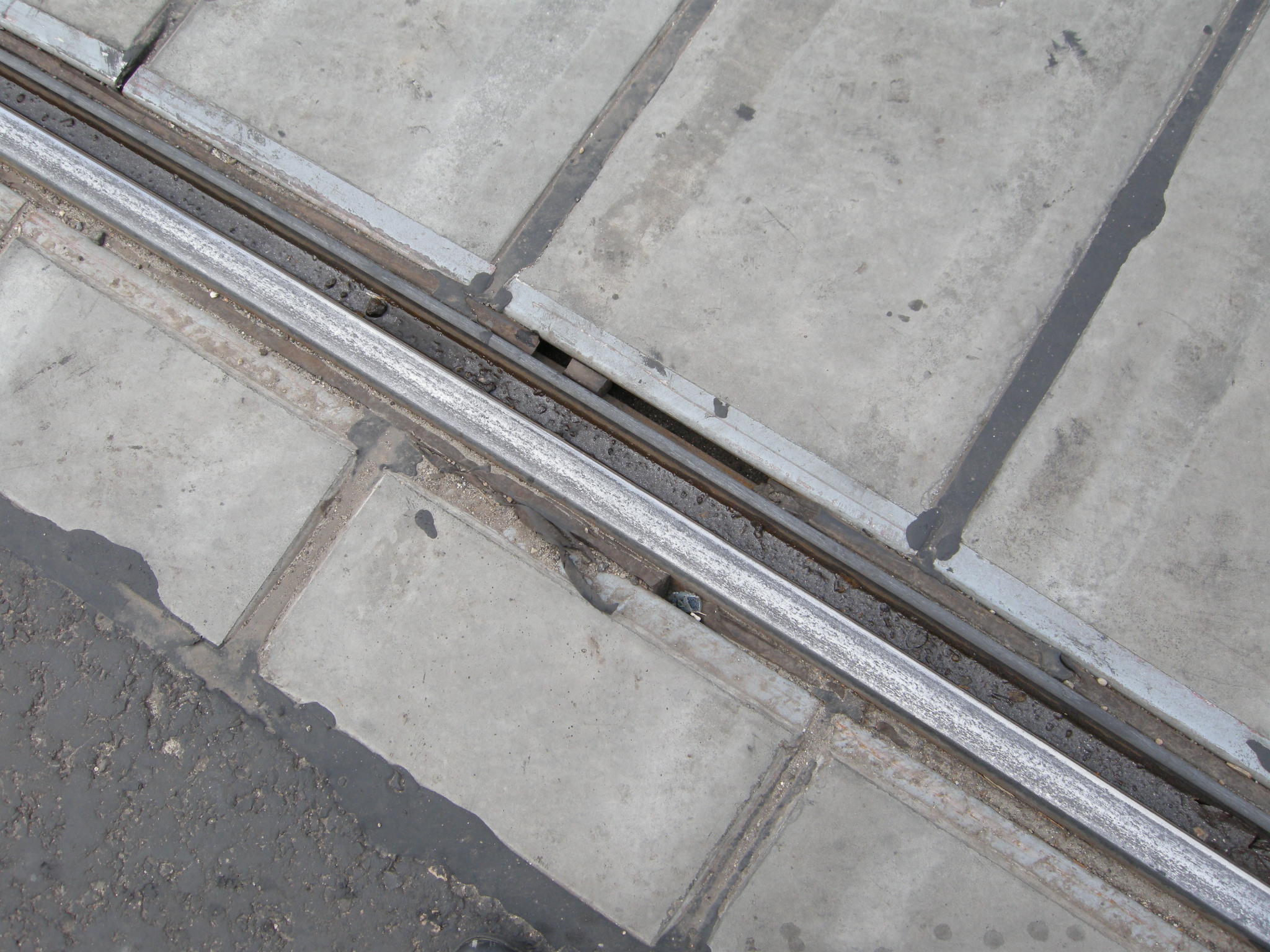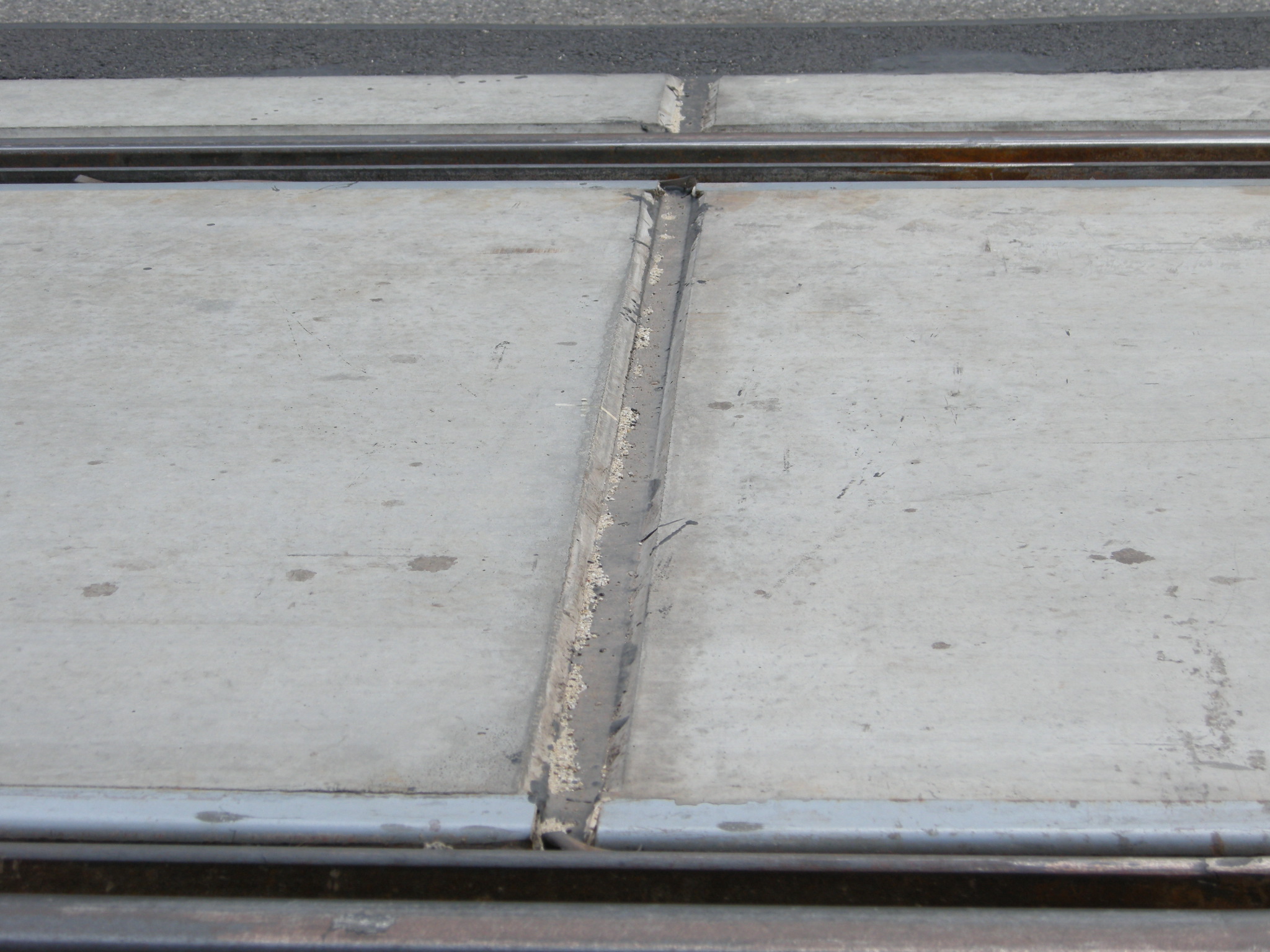 A panelek oldalait betonnal kötötték az úthoz és a járdaszegélyhez, lásd a képet. Ráadásul nem volt megfelelő tömörítő eszköz hozzá (megfelelően keskeny henger). Eredetileg itt makadám kő és kátrány volt. Mivel a panel egy kicsit mindig mozoghat, ezért valószínűleg előbb vagy utóbb ez töredezik majd és később feljön.
